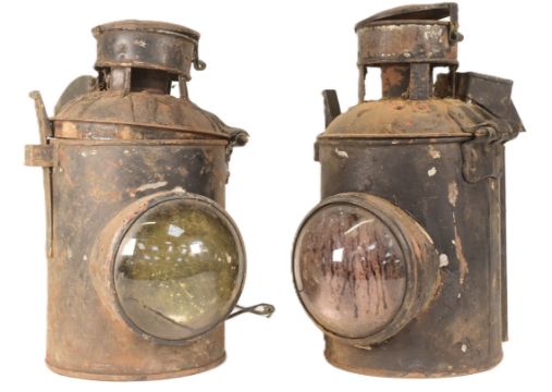 Two early 20th Century British Railway level crossing / signal lamps. The cylindrical lamps each with large bullseyes lenses. Each measuring approx 35cm.