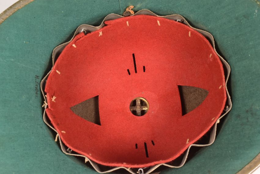 A WWII Second World War Third Reich Nazi German Afrika Korps tropical pith helmet with goggles. Green / brown felt exterior affixed with Eagle Swastika badge and a Tricolour shield.