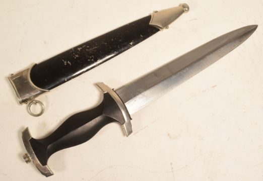 A WWII Second World War Third Reich Nazi German SS Officers parade dagger. Shaped wooden grip with inset SS roundal and metal Eagle Swastika. The ricasso stamped RZM M7/36 and the blade etched with Meine Ehre Heisst Treue. The dagger possibly being a marriage of genuine and reproduction parts. Measures approx 38cm.