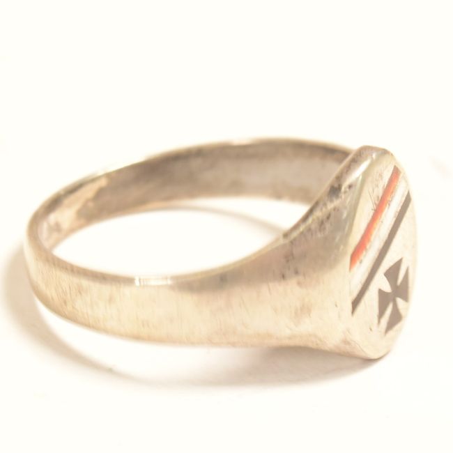 A WWI First World War Imperial German / Prussian signet ring. The 800 continental silver ring having a black Iron Cross and tricolour band. Stamped 800 on the inside.