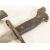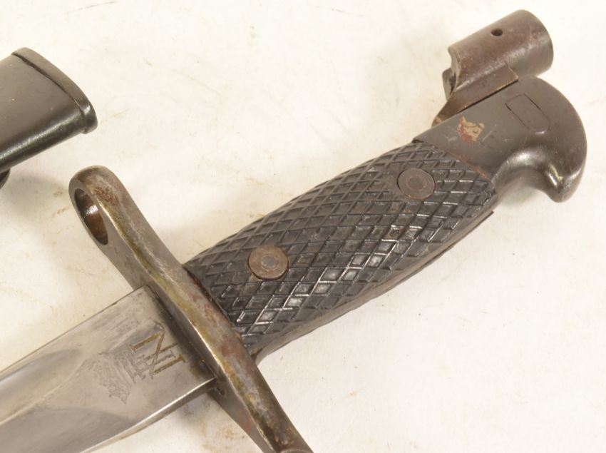 A WWII Second World War Spanish M1941 Bolo rifle bayonet with Mauser attachment. Black chequered grip, hooked pommel with press stud and Mauser attachment, cross guard with muzzle ring and quillon. The shaped fullered blade with widened tip. Toledo mark to the ricasso and numbered to other side 410. Housed within the steel scabbard. Measures approx; 40cm.