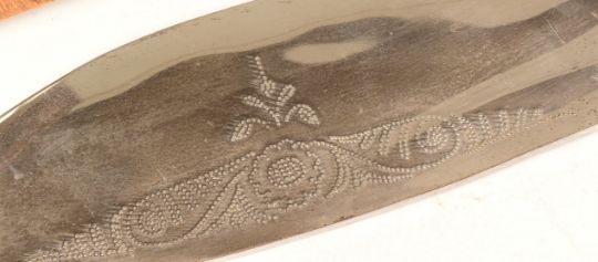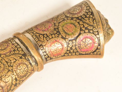 A vintage Indian wedding sword with a lion head pommel and velvet scabbard together with an Indian Kukri knife dagger with Benares brass hilt. Largest measures approx 53cm.