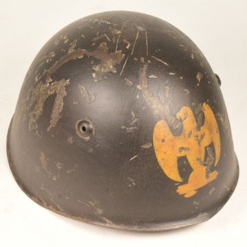 A WWII Second World War Italian Fascist / Black Shirt M33 steel combat helmet. The black helmet with hand painted yellow eagle with liner and chin strap.