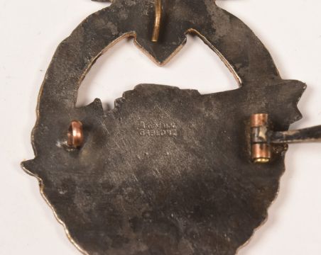 A WWII Second World War Third Reich Nazi German Kriegsmarine 2nd Pattern ' Schnell Boat ' (Fast Torpedo Boat) qualification badge in painted tombac metal. Gablone makers to verso. Boxed.
