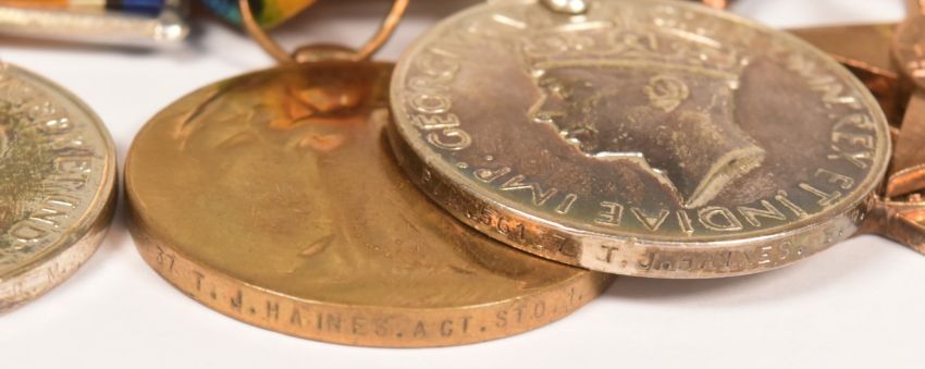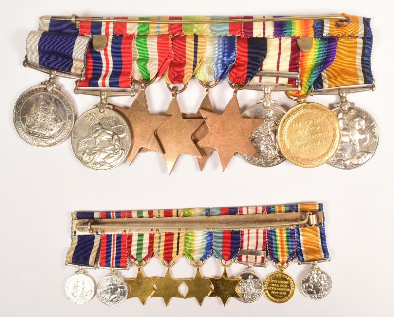A WWI First World War and Second World War medal group awarded with miniatures to one 56137 T. J. Haines Stoker Petty Officer of the Royal Navy. Medals comprising his First World War British War medal and Victory medal, Naval GSM General Service Medal with Palestine 1939-39 clasp, WWII Second World War stars comprising 1939-1945, Atlantic Star, Africa Star and Italy Star, British War medal and Royal Navy Good Conduct medal.