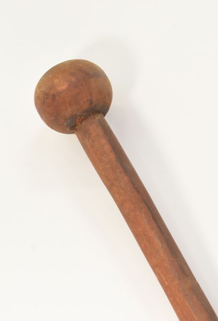 A vintage South African Zulu Tribe hide shield display of typical oval form with lattice panels mounted onto a wooden shaft with a knobkerrie style club and spear crossed on the back. Shield measures approx 59cmx37cm.