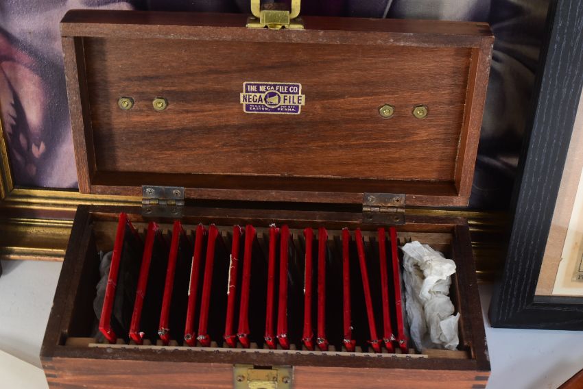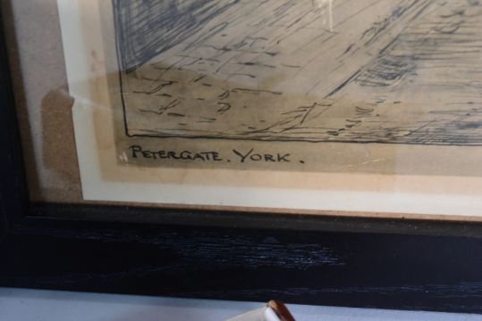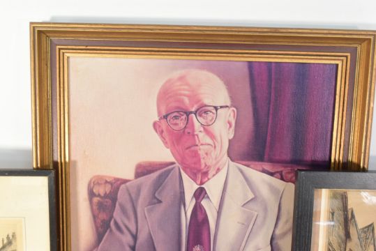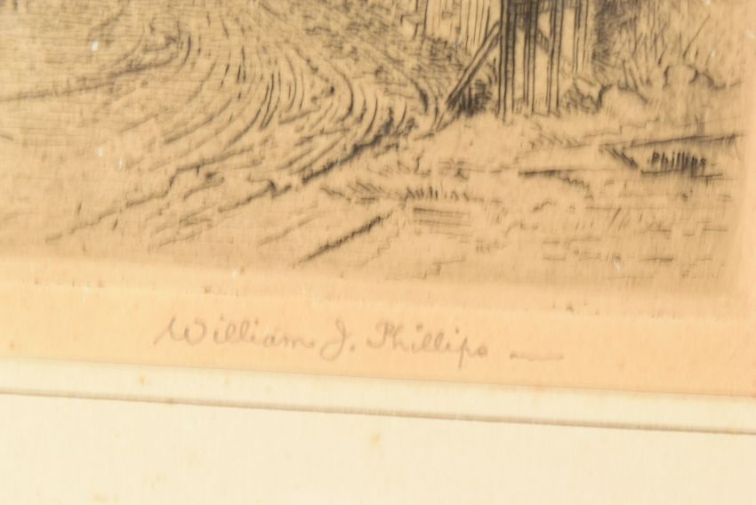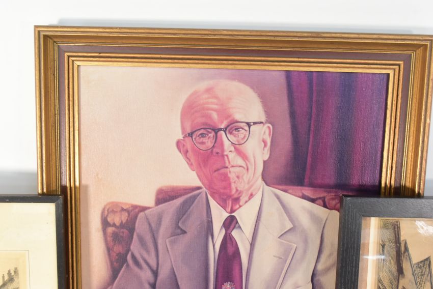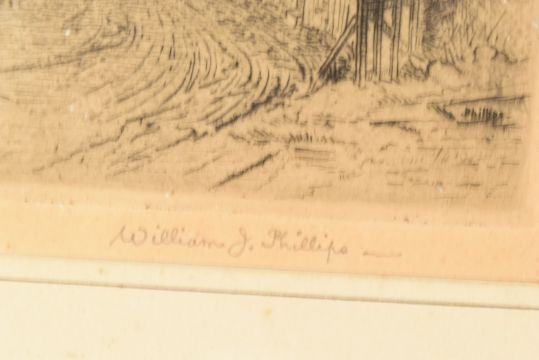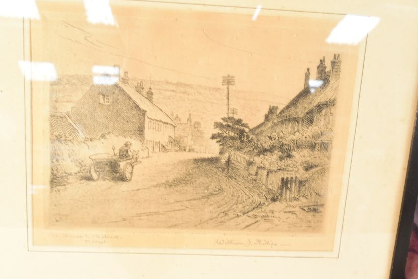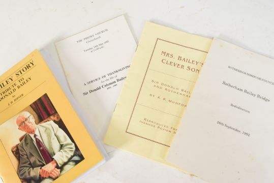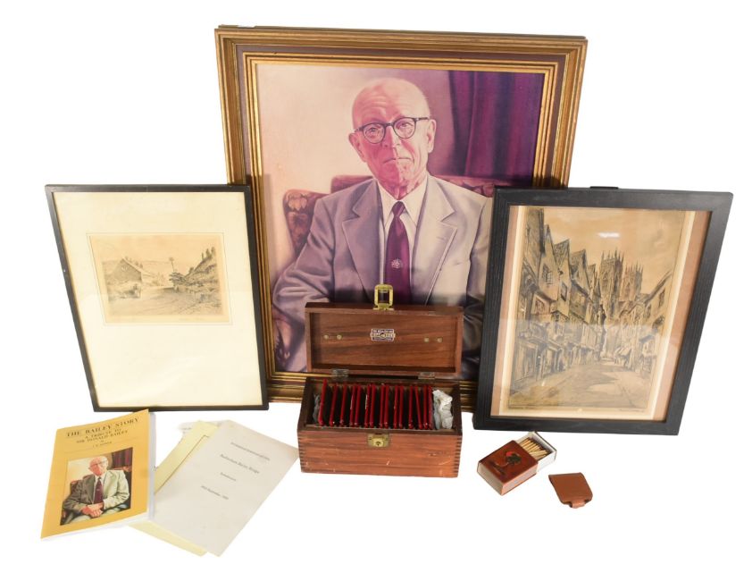 Bailey Bridge Interest - a collection of items relating to Sir Donald Bailey (Of Bailey Bridge fame) to a portrait print, original glass slides of the bridge, various booklets and order of service from his funeral plus vesta / Cigar cutter in leather case and a match box as well as 2 pictures which used to hang on his office wall - one of Petergate York and the other the road to Chideock, Dorset by William Phillips (signed). Consigned by the family.