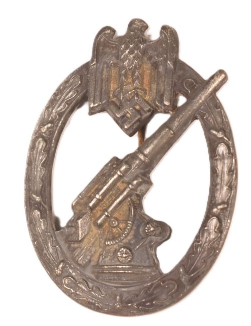 A WWII Second World War Third Reich Nazi German Army / Heer Flak Artillery badge. The badge depicting an 88 mm flak gun with the barrel facing upwards with an oak leaf perimeter jointed at the top by the national Eagle and Swastika.