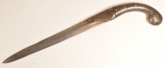 An early 17th Century Indian Mughal Empire all steel Khanjar dagger. Traditional North Indian parrot head shaped handle with traces of gold decorations and a double edged reinforced blade with armour piercing tip. Believed to be made from watered steel, possibly Bikaner. Measures approx 41cm.