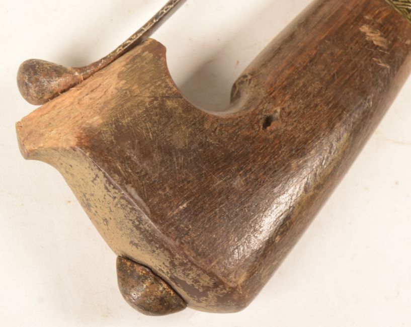 A late 18th Century North African Moroccan Nimcha sword with a large Rhino horn hilt set above downward curving triple quillons with gilt and silver damascened and a triple fullered blade. Measures approx 96cm.