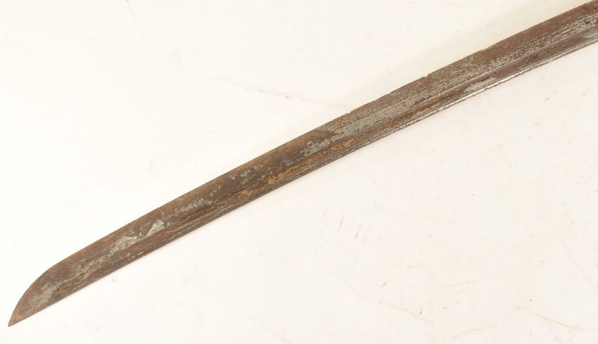 A WWII Second World War Japanese Shin Gunto / Katana Military Officers sword with signed tang. Wooden hilt bound with shark skin and plaited fabric grip with x2 hilt ornaments. Tsuba with a twisted perimeter and carved bands. Lacking scabbard. Measures approx 97cm. Please note; blade tang and hilt require some manipulation to remove.