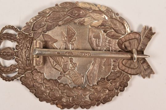 A WWI First World War Imperial German / Bavarian Pilots pilot badge. The stamped 800 silver badge with Prussian crown upon a wreath of oak leaves and laurel leaves, the centre with an early flying machine, flying across buildings and countryside.