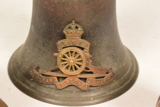Royal Artillery interest - x2 WWI First World War trench art pieces comprising an ashtray in the form of a peaked cap fashioned from a 1915 dated shell case and a matchbox holder with decorated with bullets and a flaming grenade badge together with a bell with a Royal Artillery cap badge.