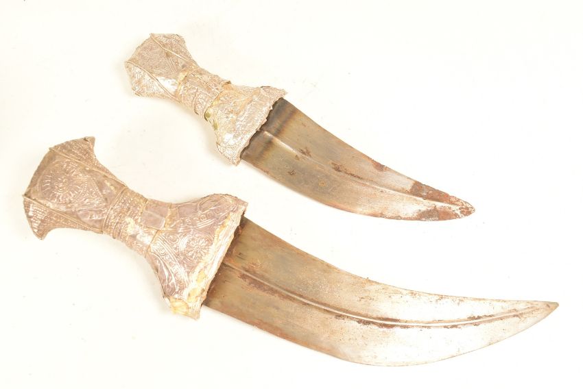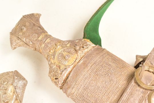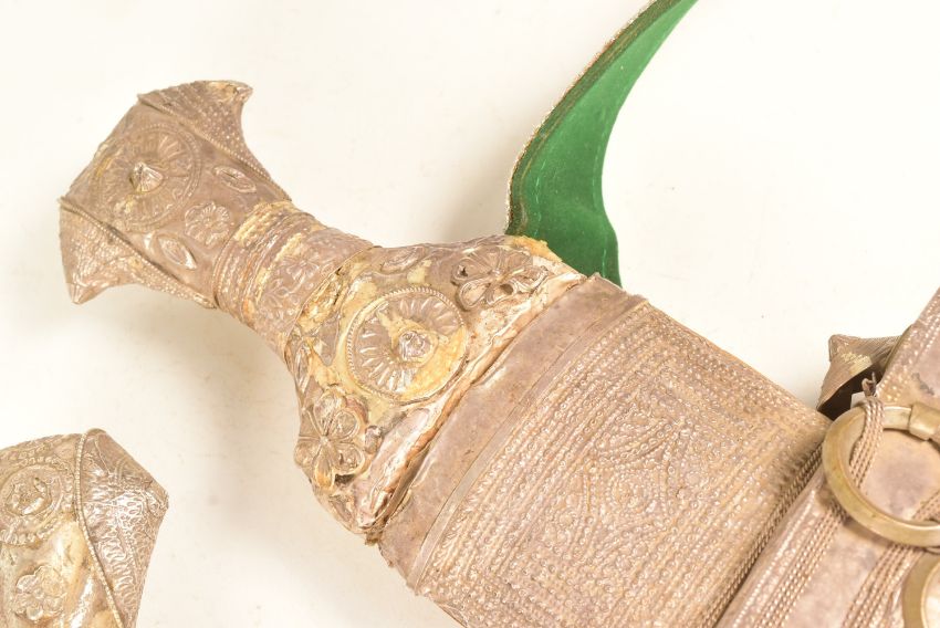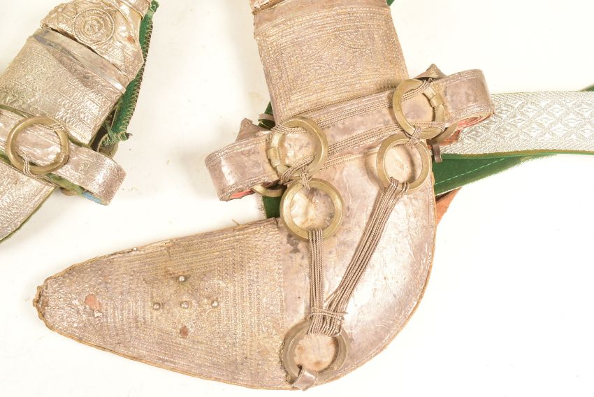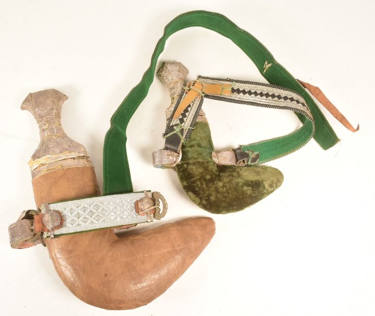Two vintage Middle Eastern / Yemen presentation Jambiya daggers with embossed pressed metal hilts and scabbards with woven rings, the smaller having a green velvet back, the larger with leather. Each with embroidered belts. Largest measures approx 30cm.