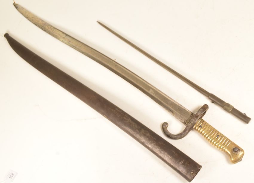Two French rifle bayonets comprising an 1866 pattern ' Chassepot ' sword bayonet with scabbard together with a MAS-36 bayonet with cruciform cross-section.