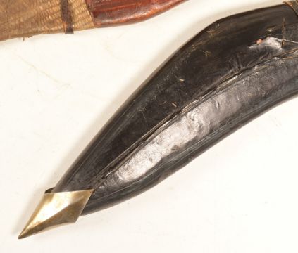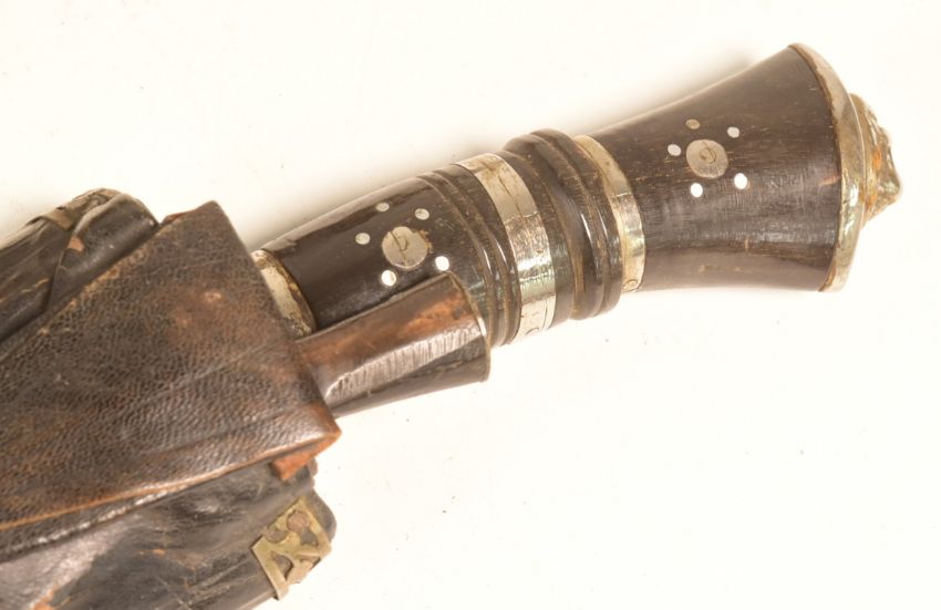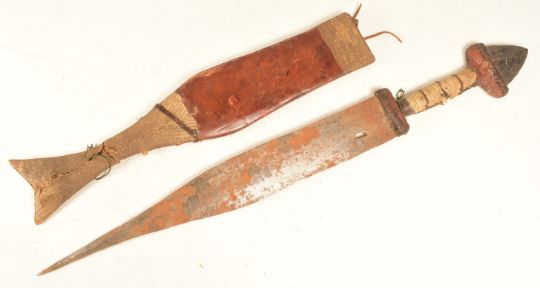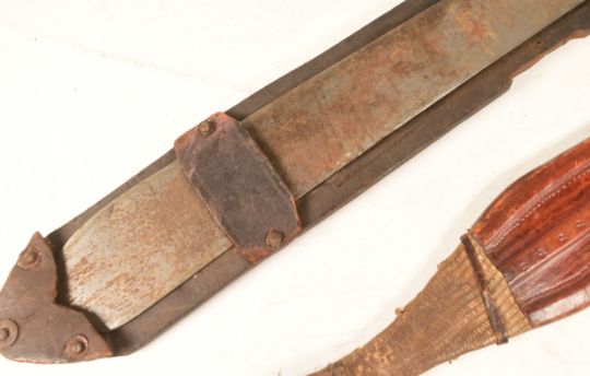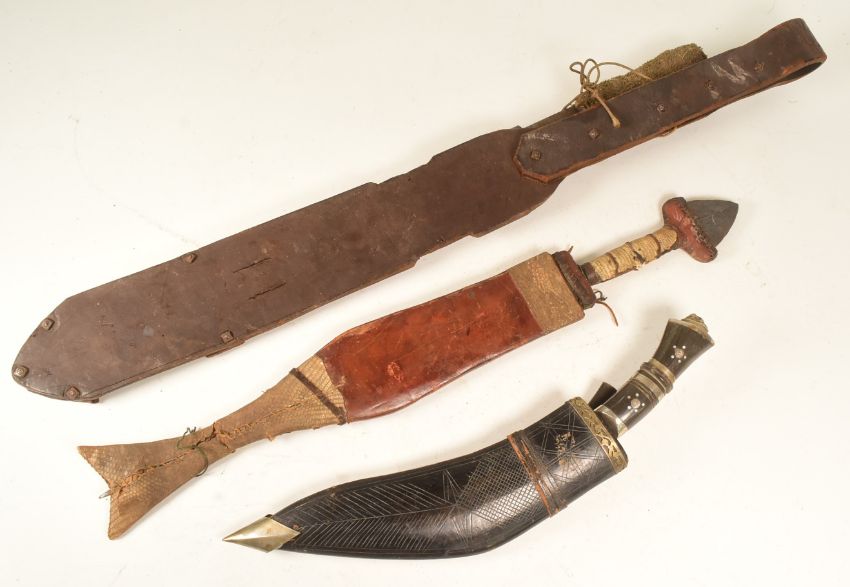 A collection of x3 assorted ethnic knives and daggers comprising an Indian or Nepalese Kukri, African dagger with an pointed iron pommel and leather sheath with snake skin panels and a Sheffield made machete. Largest measures approx 60cm.