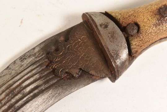 An early 20th Century Indo Persian bone hilted dagger. The pommel with three fluted tips. two bone grip plates secured with rivets and a curved blade with brass mounts on the ricasso and multiple fullers. Measures approx 31cm.