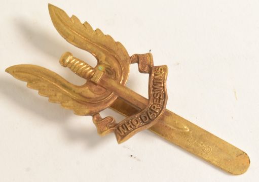An original SAS Special Air Services cap badge by Gaunt of London featuring a pair of stylized wings with a downward facing Commando dagger and the mottor Who Dares Wins banner.