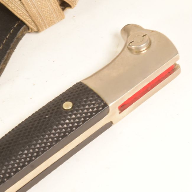 A WWII Second World War Third Reich Nazi German Kriegsmarine Assault Unit presentation bayonet. Hooked 'bird head' pommel, chequered grip plates, backward facing quillon and a blade etched with Third Reich motifs and landing boats. Housed in scabbard with leather frog and applied sword knot. Measures approx 35cm.
