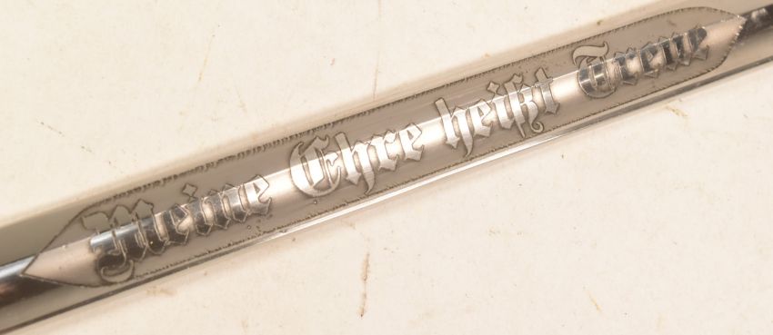 A WWII Second World War Third Reich Nazi SS Degen / SS Honor Sword with etching on the blade to the Waffen SS Police Division. The sword having a D shaped knuckle bow, black ribbed wooden grip bound with silver wire and an inset disc containing the SS runes. Blade stamped Al Coso Solingen. Measures approx 100cm.