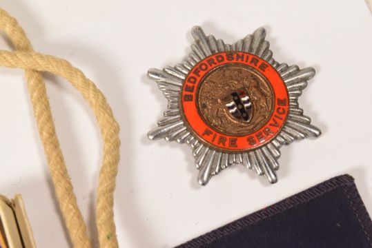 Collection of assorted militaria and fire service badges to include; Waltham Military issue 1/5 SEC. T.P. chrome cased stopwatch, Northumberland Hussars uniform buttons, ARP badge, St Johns Ambulance patch, National Fire Service, Bedford Fire Service badges and more.