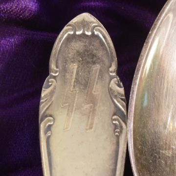 A cased set of x6 WWII Second World War style Waffen SS canteen / mess spoons, each with SS runes engraved on the handle. Spoons measuring approx 14cm.