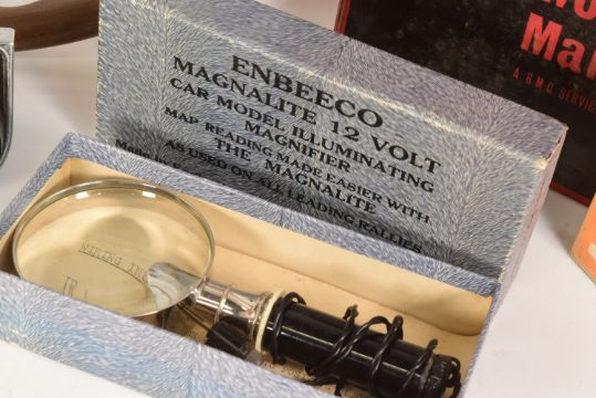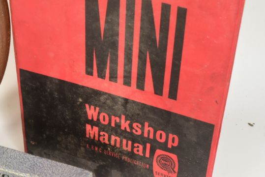 A collection of assorted vintage classic car automobilia comprising a Springall steering wheel, Smiths dashboard amp metre, Lucas Model 494 reversing lamp, Alfa Romeo Giulia owners workshop manual, mini workshop manual, 1100 & Kestrel workshop manual and a Enebee Co Magnalite 12 Volt map reading light.
