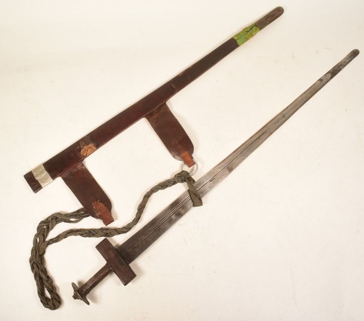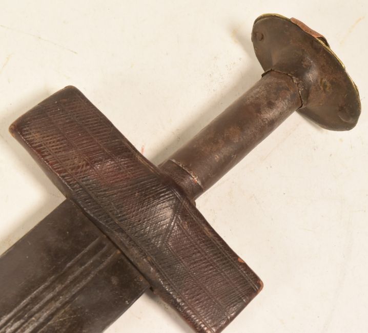 A mid 20th Century North African Tuareg / Hausa people Takouba tribal sword. Flat pommel with dome shaped layers, wooden grip with metal casing, tooled leather crossguard and a tapering blade with x3 fullers housed in a tooled leather scabbard with carry strap. Measures approx 96cm.