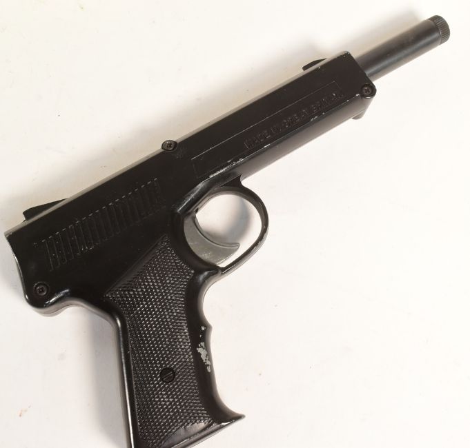 A vintage Milbro Sports Ltd Diana SP50 .177 calibre air gun pistol with original box. Spring mechanism compresses and cocks. Can fire pellets and darts.