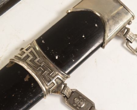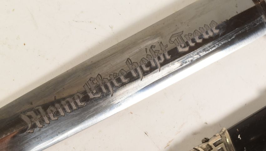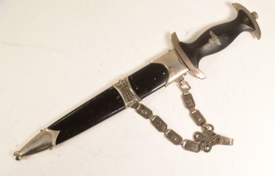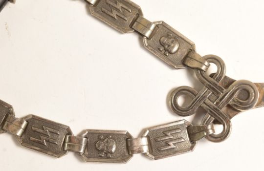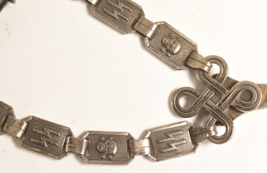 A WWII Second World War Third Reich Nazi German SS Officers chained parade dagger. The dagger having a shaped wooden grip with inset SS runes and Eagle Swastika, ricasso stamped for Carl Eickhorn Solingen and blade acid etched with SS motto. Chain with SS runes and death skull in relief. Measures approx 37cm.