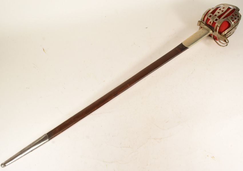 A WWI First World War Scottish basket hilted regimental broadsword. Pierced guard and red velvet cup, rayskin grip and polished blade etched with GR cypher and Seaforth 78th Highlanders crest. Makers mark for Wilkinson on the ricasso. Housed in a brown leather scabbard with white metal mounts. Measures approx 110cm.