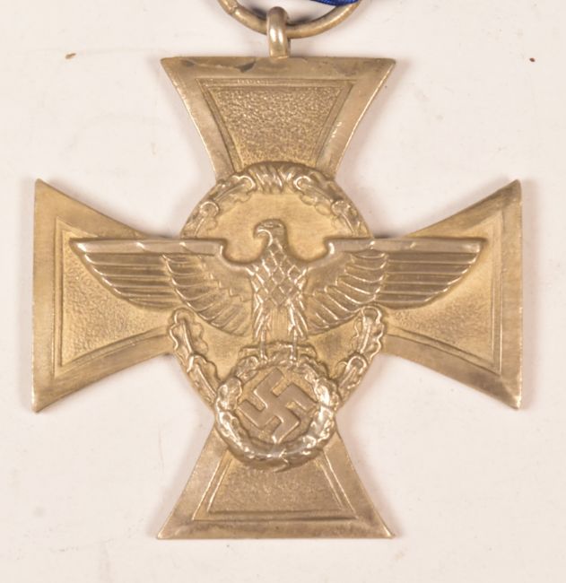 A WWII Second World War German Police Officers 18 Year Service medal depicting the national eagle swastika on a Maltese cross. Replacement ribbon.