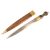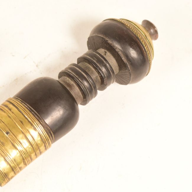 A West African Mandinka / Manding People Tribal dagger having a dome shaped pommel with brass cap and finial, chiselled wooden grip and a further brass mount. Stiletto blade etched with star motifs housed in a wooden scabbard with a brass tip. Measures approx 40cm.