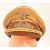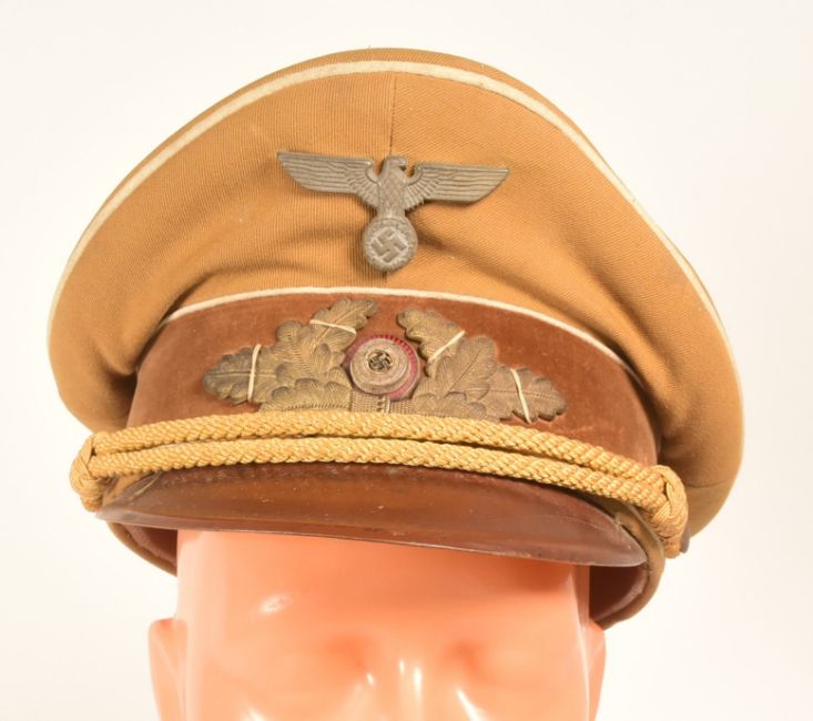 A WWII Second World War Third Reich Nazi German NSDAP Political leaders (Kreisleiter) peaked cap visor. Light brown cap with dark brown velvet band around middle, brown leather peak, white piping, yellow braid chin strap and gold Nazi eagle and wreathed swastika badges on front. Label on the twill lining for Gerhard Berbig.