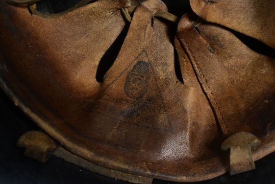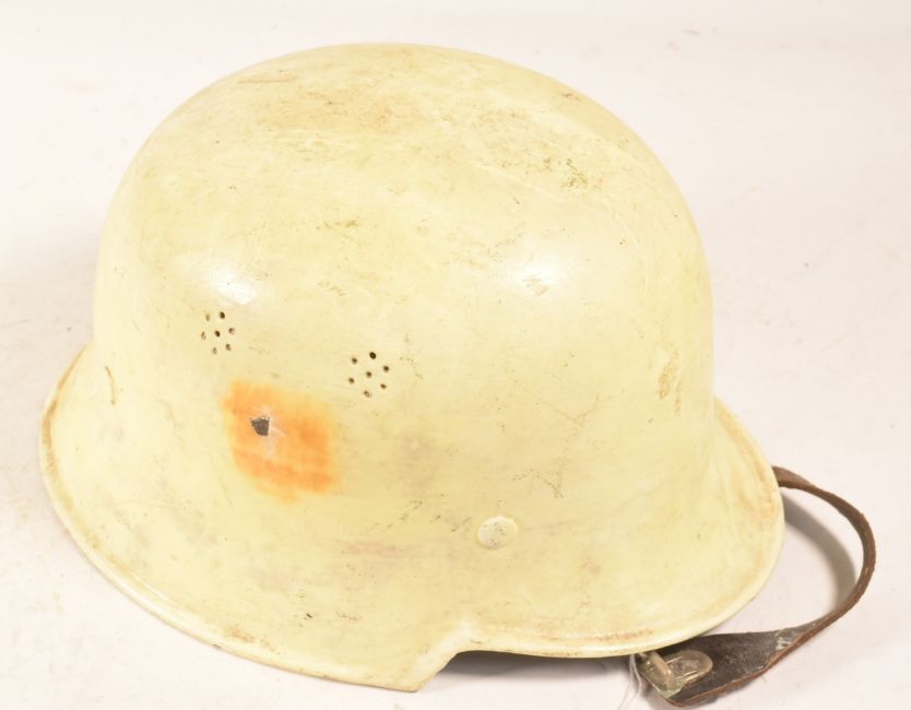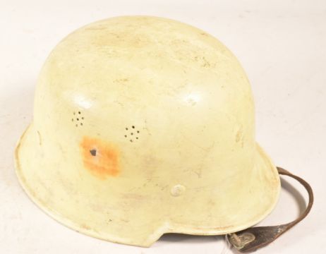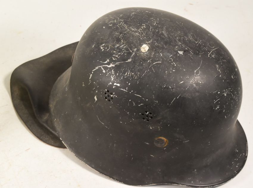 Two post WWII Second World War German Fire fighter helmets comprising a luminous painted example helmet based on the M40 steel combat helmet with signs of previously applied decals to each side and a black example with leather neck protector stamped DIN14940 on the rear inside rim.