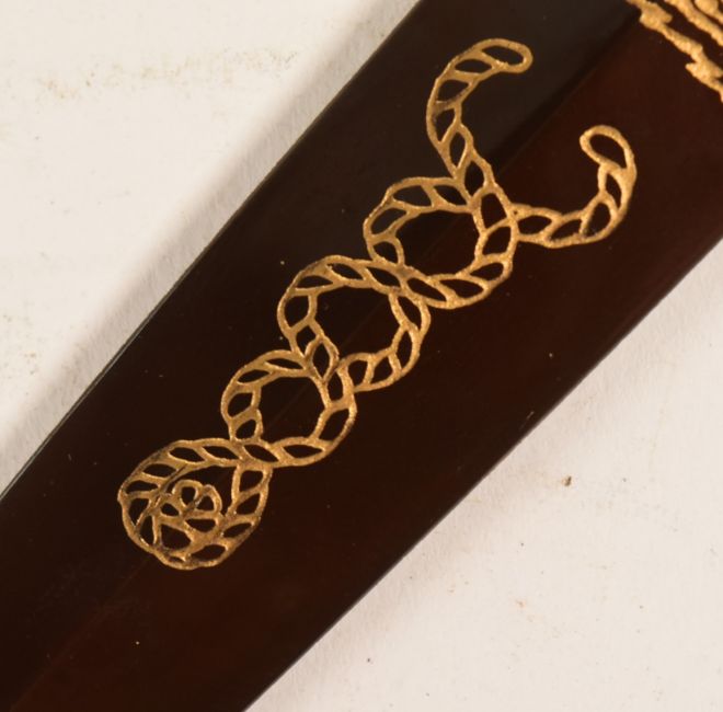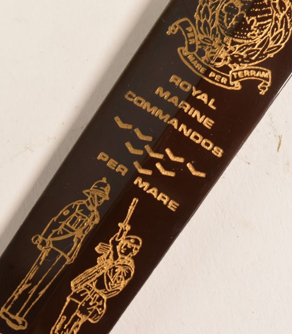 A British commemorative Royal Marines Commando FS Fairbairn Sykes presentation fighting knife. The knife having a ribbed gold painted gilt, oval guard and blued blade etched with regimental crest and images of armed Marine commandos. Sheffield makers on the ricasso. Measures approx 30cm.