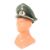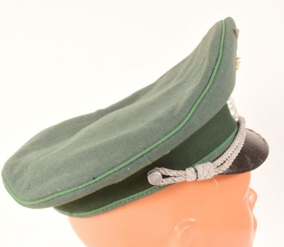 A WWII Second World War Third Reich Nazi German Mountain Troop Officers peaked cap visor. Green wool exterior with a dark green felt band, Edelweiss flower pin badge, Eagle Swastika aluminium cap badge and oak leaf wreath surrounding a roundal.
