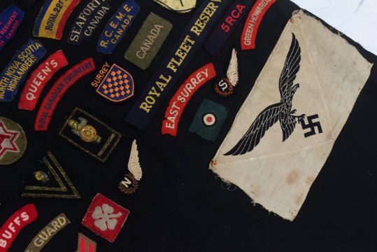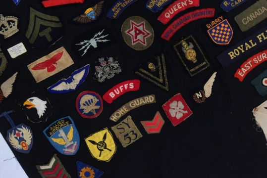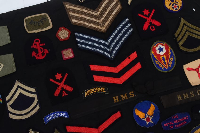 A WWII Second World War Military patch blanket containing over 80 uniform cloth patches to include; First Allied Airborne, West African Frontier Force, Royal Canadian Army Service Corps, Seaforth Canada, Buffs, Green Howards, German Third Reich Luftwaffe, Chevron Ranks and shoulder titles and more. From a genuine childhood collection. Sheet measures approx 72x150.