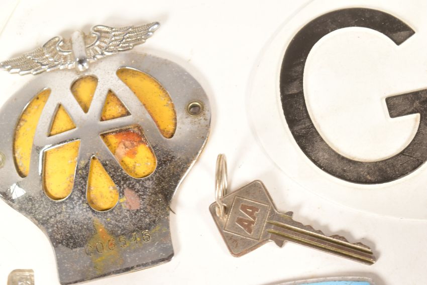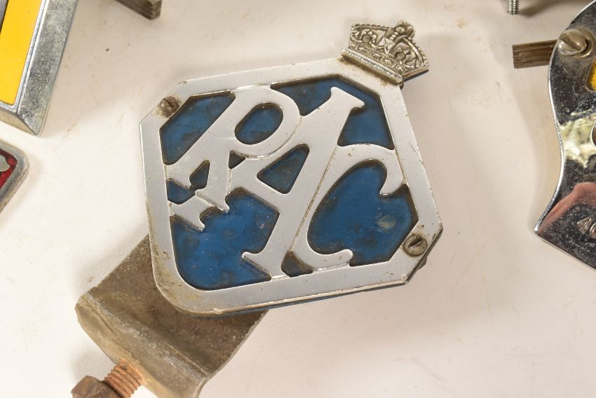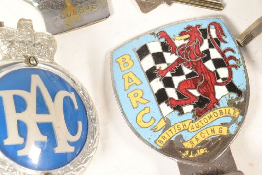 Automobilia - a collection of vintage classic car badges comprising; RAC Royal Automobile Club (King and Queen Crown examples), The AA, Alpha Romeo Owners Club, Hants & Berks Motor Club, BARC British Automobile Racing Club and assorted Mobil Oil Company Cards.