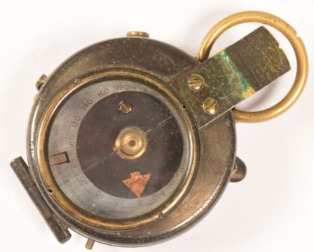 Two early 20th Century WWI First World War period compasses comprising a Negretti & Zambra Verners pattern MKVII military marching compass (lacking needle) with a leather case and a greencard prismatic pocket compass engraved on the back ' Charles Owen, Optician, 46 & 48 City Road E.C D Radcliffe '.