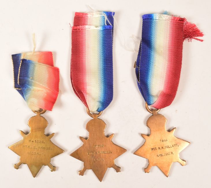 A collection of x3 WWI First World War 1914-15 Star medals awarded to; F-1022 Pte G. Wragg of the Middlesex Regiment, 7644 Pte R. H. Collett of the Gloucester Regiment and 67633 Gnr A. F. Brown of the Royal Field Artillery.