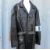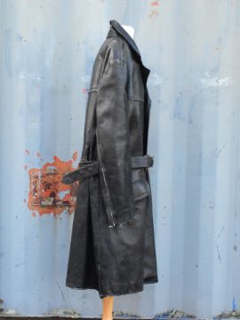 A WWII Second World War period leather trench coat with Free French Resistance armband. The black leather coat with 3 front buttons and side pockets and belt.