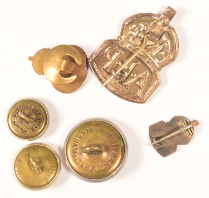 A collection of assorted WWII Second World War British Military badges to include; hallmarked silver ARP Air Raid Precautions badge (Royal Mint, 1939), Central Markets Rifle Club medal to one J. P. Wright (Daniel G Collins, Birmingham, 1909), The Patriotic Society Rifle Club medal to J. P. Wright winner of the automatic rifle competition (J A Restall & Co, 1907) and others.