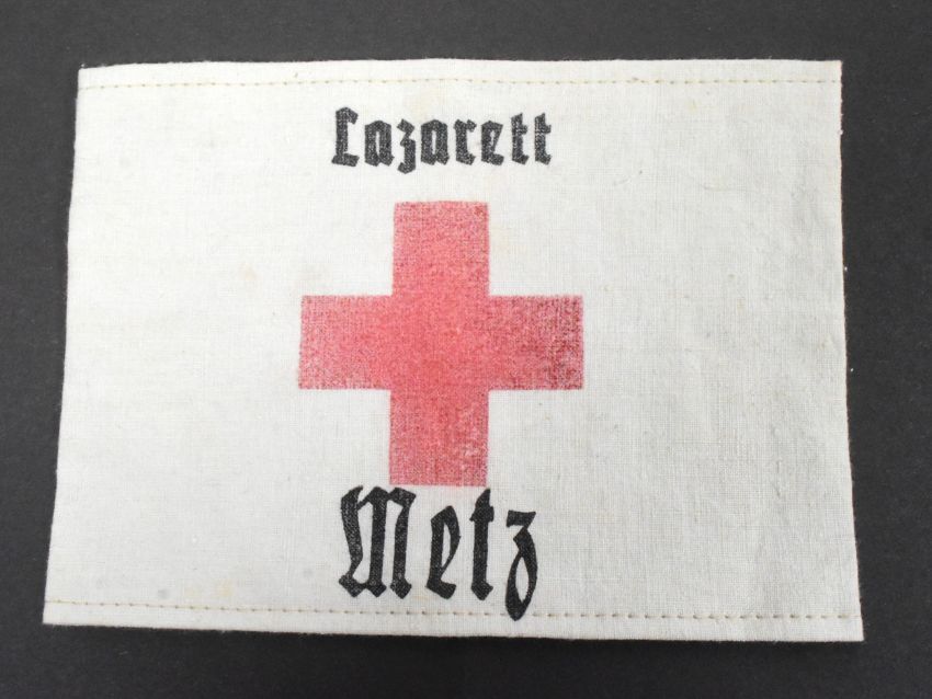 A WWI First World War Imperial German Army Military Hospital worker armband with a notation for a hospital in Mainz. Dated 1916 with an Iron Cross.