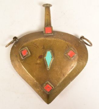 A 19th Century North African Moroccan Berber People musket powder flask. Brass hart shape with a tall nozzle and turquoise and red enamel inserts. Measures approx 22x19cm,.