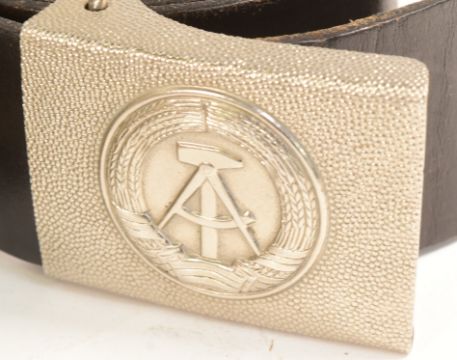 A vintage East German DDR Democratic Republic uniform belt and buckle together with a Berlin 1963 pistol holster and British Army brown leather Same Browne belt.