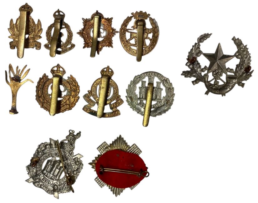 Military Cap Badges - a selection of 11 mixed cap badges in brass and metal. Examples include Scottish Kings Borderers Own, The Royal Scouts, Intelligence Corps, Royal Army Medical Corps, York & Lancaster, Army Ordnance Corps, Royal Engineers and others. Largest measures approx. 7cm wide.
