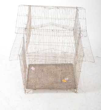 A vintage mid century white painted wire-work birdcage. The bird cage floor standing, featuring two tiers in the style of a house & with door and two arched windows to front. Raised on four hairpin feet. Measures approx. 84cm x 66cm x 44cm.