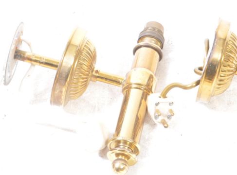 A collection of nine contemporary brass wall sconces. Each sconce having rounded mount with gadrooned detail, and reverse finial to lower.