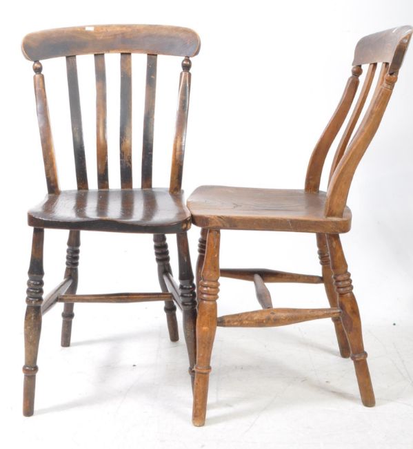 A collection of five Victorian 19th century country farmhouse beech and elm wood slat back Windsor dining chairs. Raised on turned legs with stretchers having elm seats. Lathe style back rests with shaped top rails to each. Measures approx: 88x46x48cm